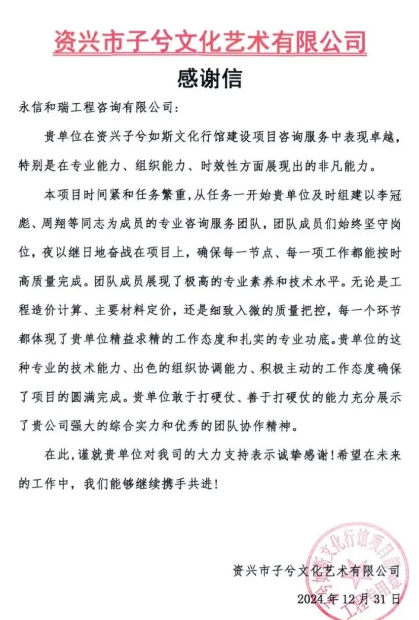 資興市子兮文化藝術(shù)有限公司對(duì)大灣區(qū)深圳分公司所提供的服務(wù)給予高度評(píng)價(jià),對(duì)我司在專業(yè)能力、組織能力、時(shí)效性方面展現(xiàn)的非凡能力表示贊賞,并對(duì)我司的大力支持表示誠(chéng)摯感謝。未來(lái)我司將在造價(jià)咨詢這一傳統(tǒng)優(yōu)勢(shì)領(lǐng)域繼續(xù)深耕,延續(xù)一以貫之的硬實(shí)力、高水準(zhǔn),進(jìn)一步在更多不同地區(qū)擴(kuò)展業(yè)務(wù)版圖。