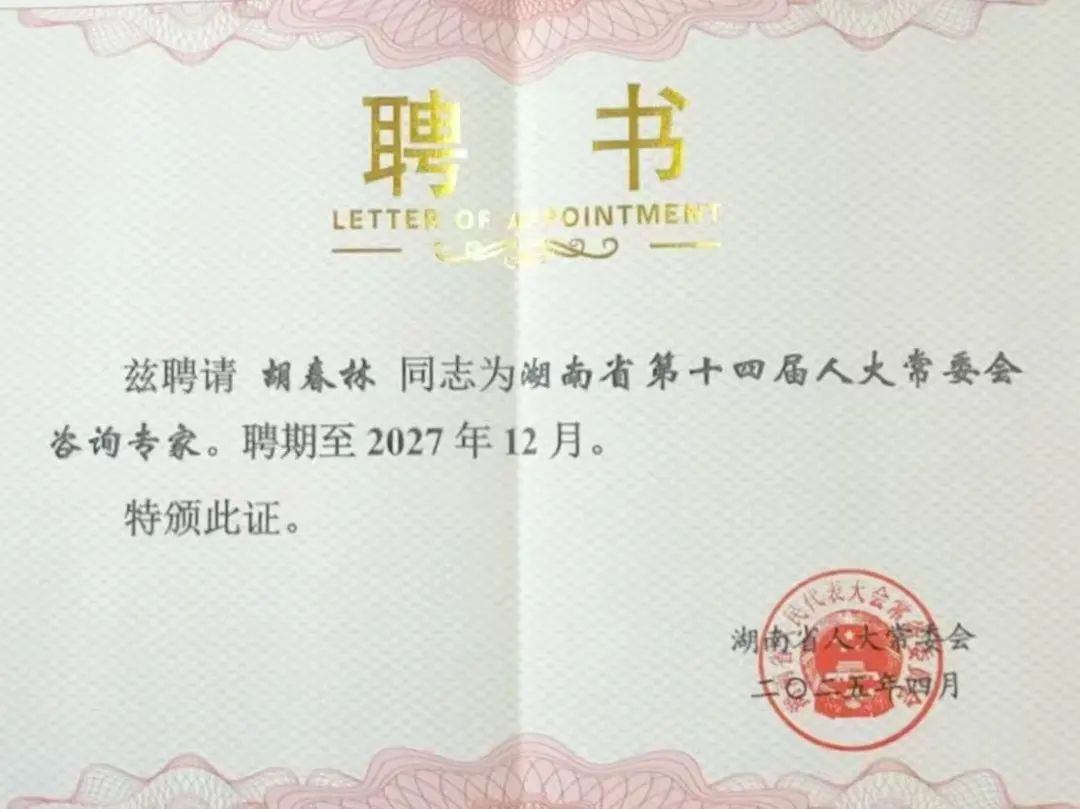 喜訊 | 胡春林董事長受聘擔任湖南省第十四屆人大常委會咨詢專家